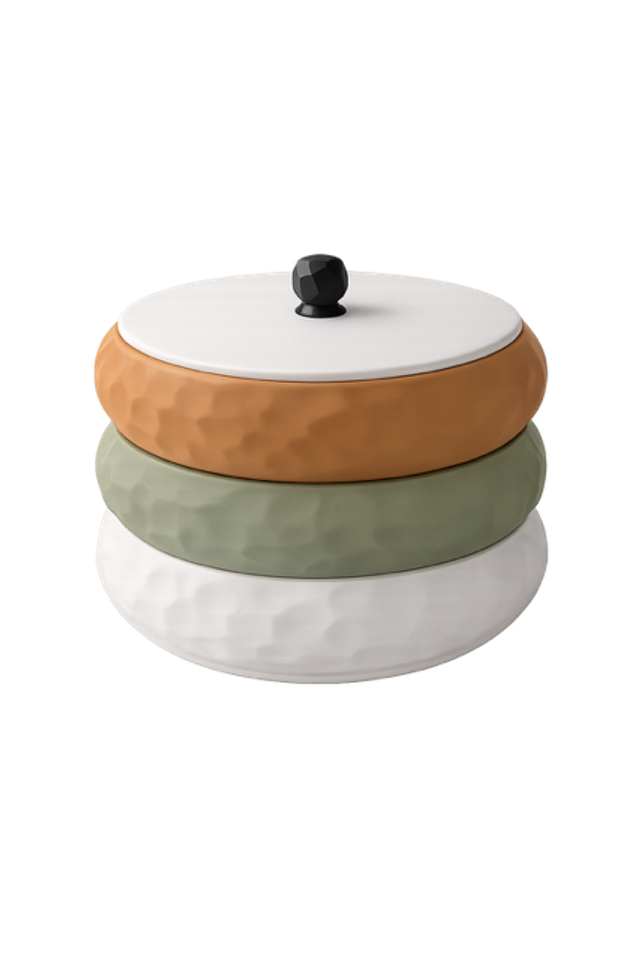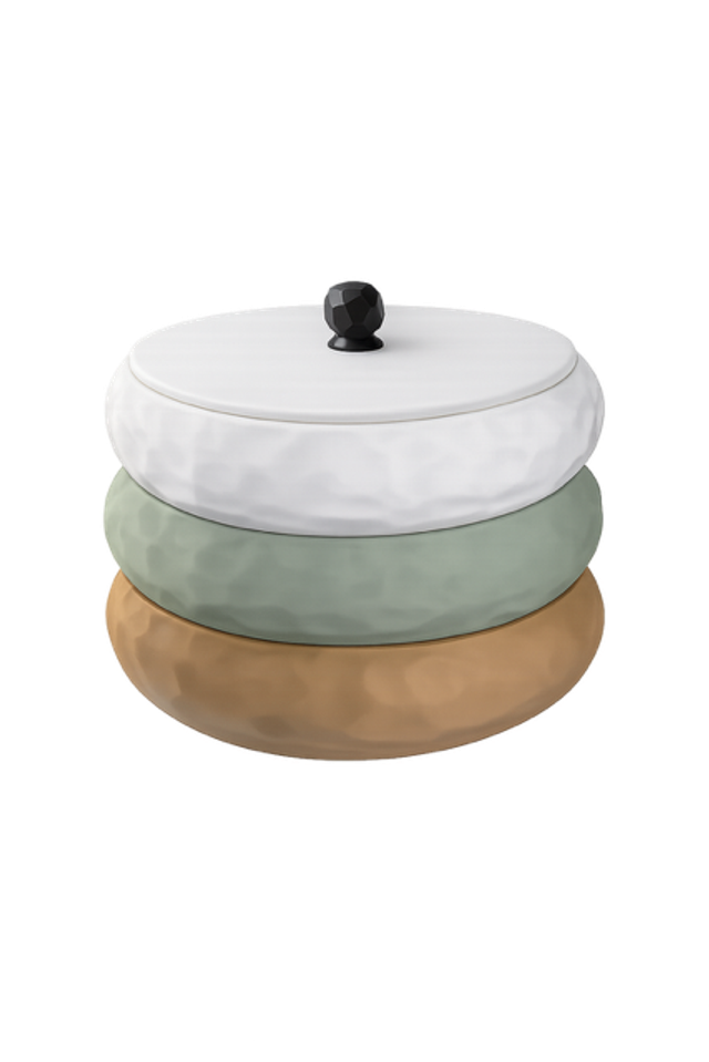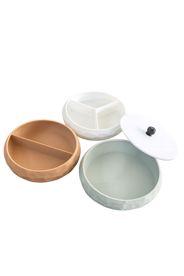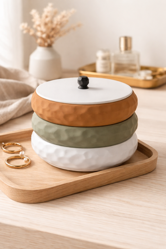 Sa forme ronde, son motof texturé et son système de compartiments intégrés composent un objet à la fois lisible, stable et naturellement fonctionnel.Chaque module peut-être utilisé seul ou empilé, permettant de créer une composition modulable selon les usages : bijoux, clés, accessoires ou petits objets personnels.